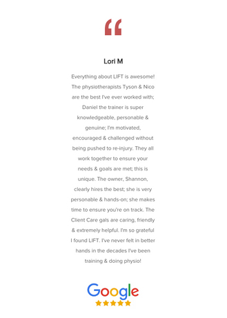 At LIFT Fitness & Physiotherapy, our clients' satisfaction is our top priority. We are proud to be a trusted partner in their journey to a healthier and happier lifestyle. Don't just take our word for it, hear what others have to say about working with us and start experiencing the benefits of our customized approach.
